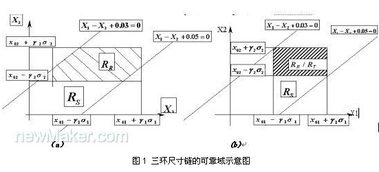 如图1中,显而易见,可靠域、装配成功率要使尺寸矢量X落在图中有剖面线的区域内。对于任一尺寸链,该区域即为可靠域(reliable region 简称Rr )它是安全域Rs 、公差域Rt 的交集,在数学上可表示为: