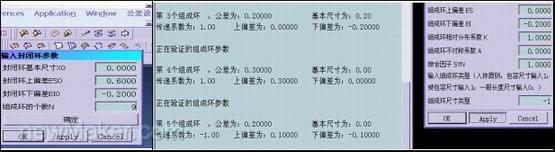 应用公差分析模块进行公差分析:尺寸链的参数输入:打开UG,选取[公差设计]菜单的[公差分析]子菜单,弹出对话框,按下“确定封闭环参数”按纽,弹出输入封闭环参数对话框,这时要求输入封闭环参数(见图3中左面的对话框);完成了封闭环参数的输入后,按下“输入组成环参数”按纽,弹出输入组成环参数对话框,要求输入各个组成环参数,输入过程(见图3中右面的部分)中增环的传递系数输入正数,减环的传递系数输入负数。输入后,按下“apply”键后,程序会打开消息框,显示刚刚输入的信息,如果发现不正确或输入不完全,可以重新输入,再按下“apply”键,若正确,键下“ok”键确定即可。全部参数输入后,再选择公差分析的方法,针对这个例子,选取[经验公式法],即可输出公差分析的结果,如图3所示(图3中还应用了极值法结果作为对比)。