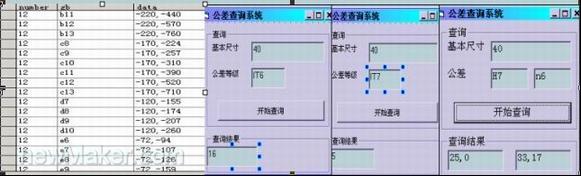 公差自动查询库的使用说明:参照图4中,第一个小图和第二个小图是输入基本尺寸数值,在“公差等级”中输入公差等级代号,在“查询结果”中就可以得到对应的公差标准数值;反之,输入基本尺寸数值和公差标准值,也可以查询到对应的公差等级,即可以双向查询。第三个小图在基本尺寸中输入尺寸数值,单位是mm.在“公差”中输入公差带代码,在左边的编辑栏中输入孔的公差带代码,在右边的编辑栏中输入轴的公差带代码,输入了以后单击“开始查询”在“查询结果”中会显示两组数据,左边为对应的孔的极限偏差,右边为对应的轴的极限偏差,单位是µm;反之,输入尺寸数值和对应的孔极限偏差数值、轴极限偏差数值,可以查询得到孔和轴的配合类型。