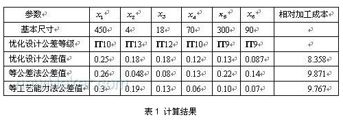 分析计算结果见表1,经优化后的尺寸链加工成本比传统公差优化设计方法节省加工成本15%。