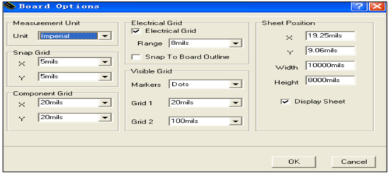 6.首先可以通过当前菜单的 Design > Board Options 修改当前设置对话框的 Sheet Position中Width 设置为2000mils , height 设置为1000mils