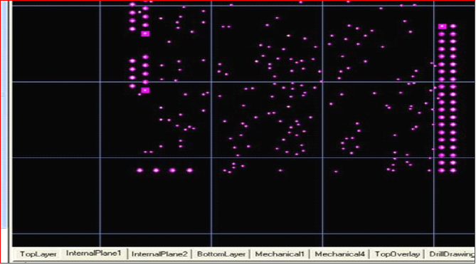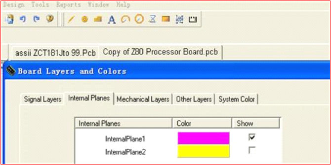 图1:勾选显示内电层设置 首先热键Shift + S单层显示查看原来的四面板,如下图是显示的内电层internerPlane1的,同时可以查看其他的层:toplayer、internalPlaner2、Bottomlayer、Mechanical1、Mechanical4、TopOverlay、keepoutlayer等,其他需要显示的层及颜色都可以在对应的颜色层中设置修改!