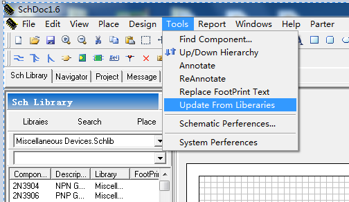 1.在SchDoc中打开一个原理图文件,然后执行Tool > Update From Libraries。如图1: