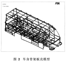 车身模型完成之后,选用四边形单元进行网格划分,局部划分不成功的区域单独挑出选用三角形单元进行二次划分。网格划分完毕,车身骨架有限元模型完成(图2)
