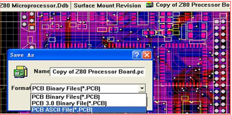 青越锋导入其它同类软件的PCB文件 DXP ,Protel2004 ,以及最新的AD.*版本等的软件直接打开的PCB文件当前界面下直接单击菜单File > Save as 选择ASCII 格式的文件类型即可。