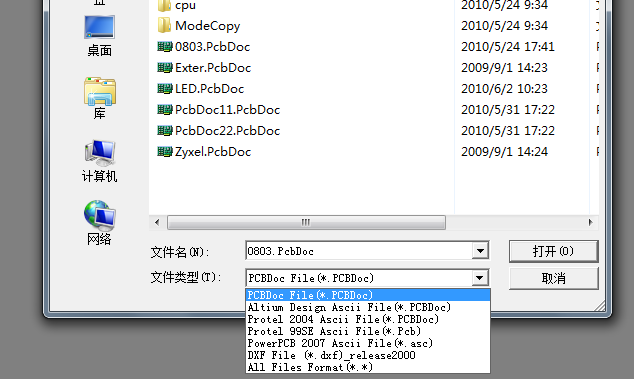 图3 3.然后打开青越锋PcbDoc,执行File>Open,在弹出的打开窗口选择你所要打开的文件名和文件类型即可。如图4所示: