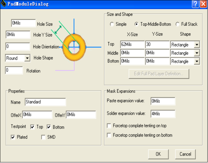 图1:pcblib中焊盘设置界面 2.图1所示:因要设置表面贴的焊盘,所以将界面中 >> hole size(钻孔水平X轴的宽度)设置为0; >> hole Y size (钻孔垂直Y轴的宽度)设置为0; >> hole orientation (钻孔角度)设置为0;hole shape 就可不选; >> degree rotation 设置焊盘角度,默认的为水平角度,这里设置为0; 其他默认。 >> size and shape 焊盘类型设置为top-middle-bottom,首先设置顶层:设置的参数为x-size,y-size,shape依次为62mils,30mils,rectangle;中间层middle以及顶层bottom设置及结果如图1; 3.顶层图形结果显示如图2: