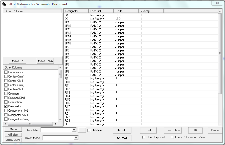 图2 3.在弹出的物料报表中,通过选择“其他信息专栏”来“上移”或“下移”进行元器件的分类查看。通过勾选“其他信息专栏”中的项目标题来显示当前需要查看的元器件的信息,以及通过选种一行列表信息右键单行输出或通过下面的标题报告(TXT格式)或输出(csv格式可通过excl格式打开),来查看或打印;同时可通过此对话框下面的选项来进行设置模板文件,物料信息邮件发送等多种查看方式,快速实现无纸化的绿色查看方式。