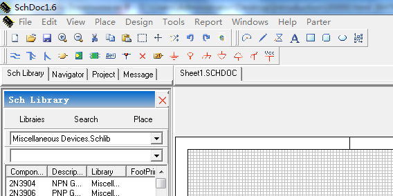 1.在File菜单中选择File > New,则系统默认的一个名为Sheet1.SchDoc的原理图,在主设计窗口中自动打开.如图1: