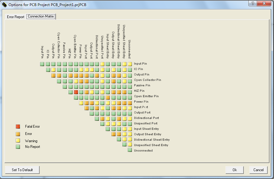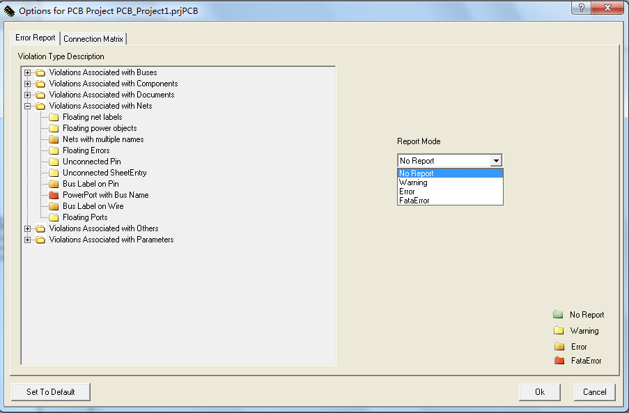 1.执行Design > Peoject Option.可在Report Mode 的下拉菜单中选择违规类型描述的报告模式,以及在Connection Matrix栏下也可以使之信息提示的报告模式。 如下两图所示: